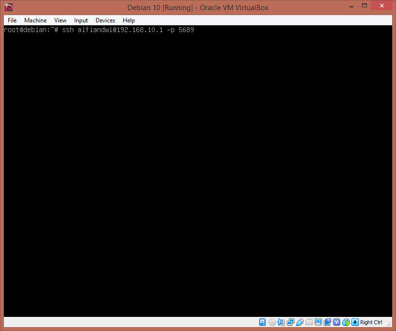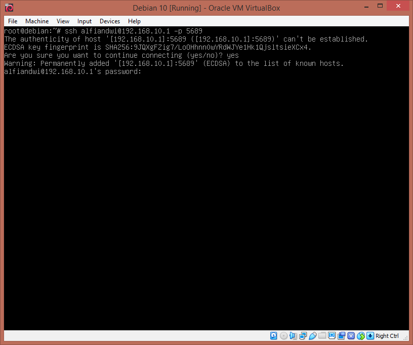sebagai contoh diatas saya ingin me remote server dengan almat 192.168.10.1 yang dimana saya masuk sebagai user alfiandwi dan memiliki port 5689.