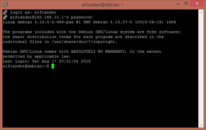 dan berhasil masuk ke server, sekarang kita bisa menggunakan Putty ini untuk meremote server debian 10 kita.